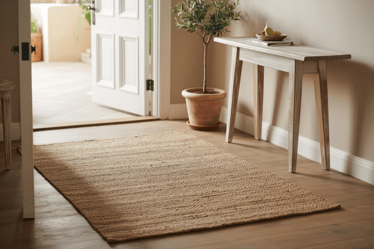 Kombiniere dazu Läufer oder Teppiche in neutralen Farben – z.B. Jute, Baumwolle oder hellem Grau. Vermeide dunkle Muster, da sie den Raum optisch verkleinern.