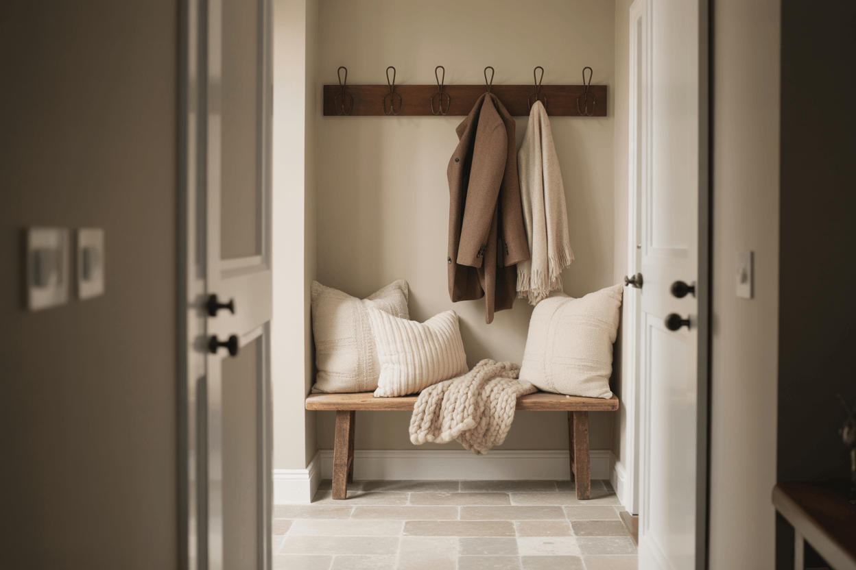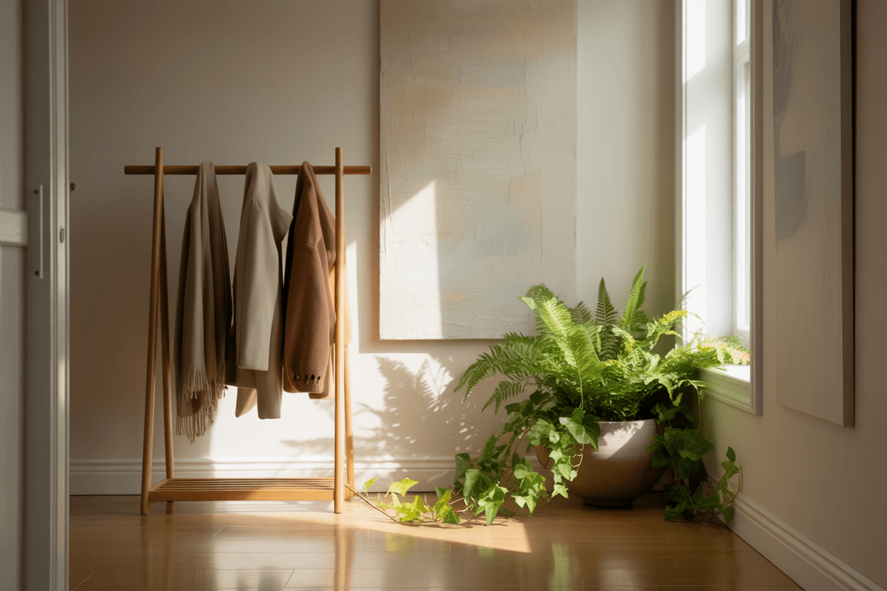 Kombiniere dazu weiße oder beigefarbene Körbe für Mützen, Schals und Schlüssel – funktional, aber ästhetisch.