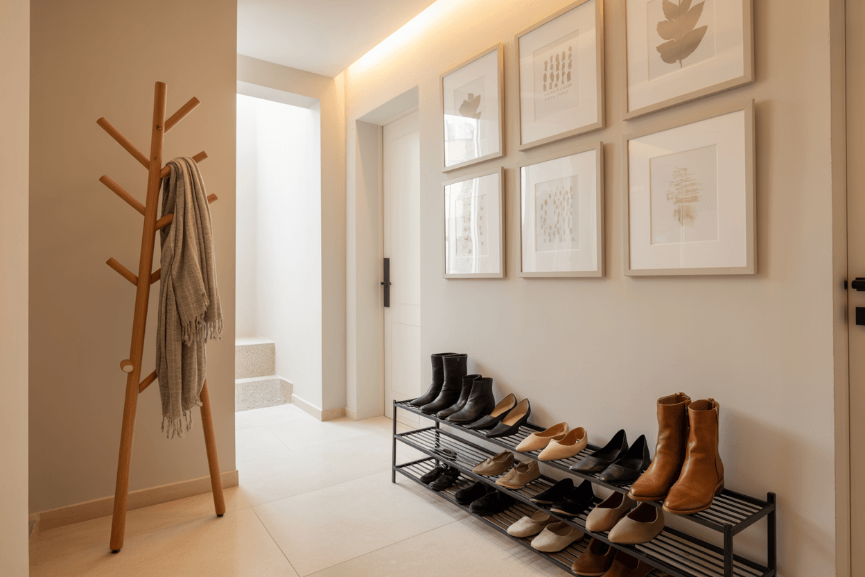 Ein heller Flur lebt von Ordnung. Zu viele Schuhe, Jacken oder Accessoires schaffen Unruhe. Reduziere auf das Wesentliche und nutze clevere Aufbewahrung: