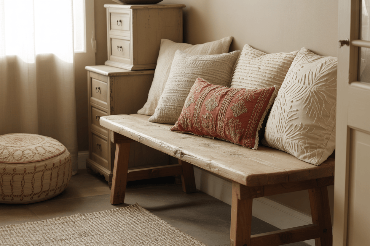 Holz, Rattan, Leinen oder Keramik bringen Wärme und Natürlichkeit in neutrale Räume. Ein kleiner Holzstuhl oder eine Bank mit Kissen in Naturtönen sorgt für Charme und Gemütlichkeit, ohne den hellen Gesamteindruck zu stören.