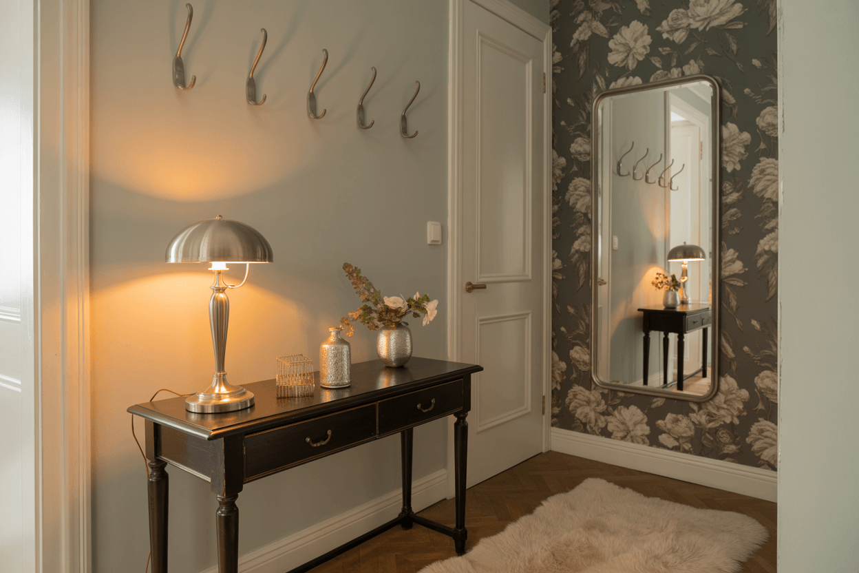 Ein heller Flur darf gerne kleine Highlights haben – etwa durch goldene oder silberne Wandhaken, eine Messinglampe oder Holzrahmen. Wichtig: immer dezent einsetzen, damit der Raum luftig bleibt.