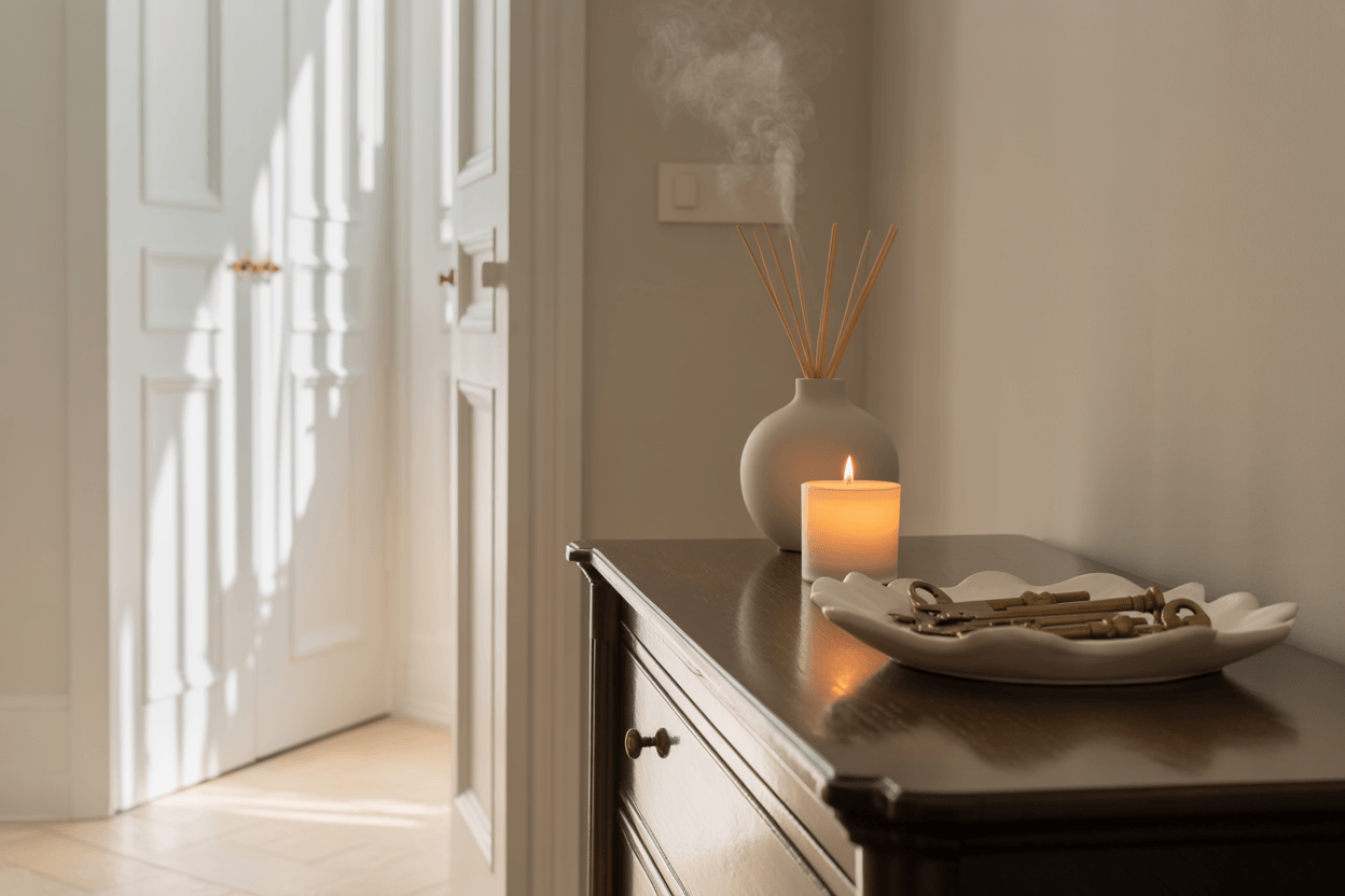 Ein Flur wirkt nicht nur durch Licht und Farbe, sondern auch durch Atmosphäre. Ein dezenter Raumduft, etwa mit Zitrus- oder Baumwollnoten, verleiht Frische und ein Gefühl von Sauberkeit. In Kombination mit hellen Farben entsteht ein rundum angenehmes Entrée.