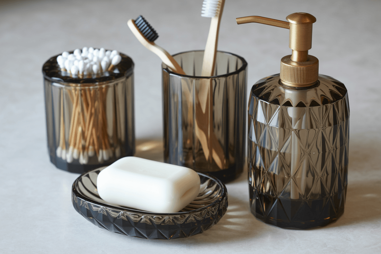 Die feine Prägung des Glases schafft eine fühlbare Textur, während das schwere Glas selbst dem Seifenspender und dem Zahnputzbecher eine elegante Anmutung verleiht.