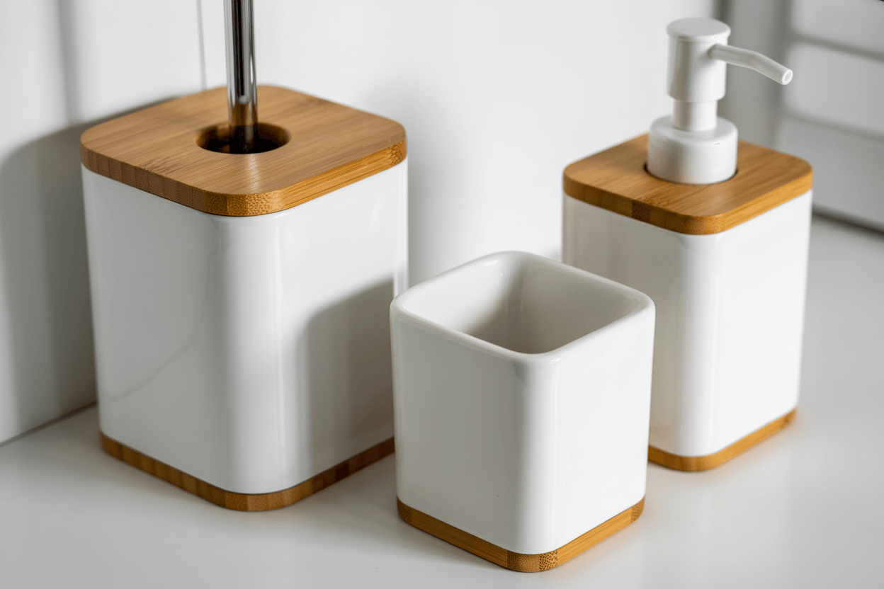 Wenn dein Badezimmer Stil eine Spur Wärme und Natürlichkeit vertragen kann, wähle Serien, die den klaren Look von Polyresin mit natürlichen Elementen wie Bambus kombinieren. Serien mit Bambus setzen auf ein schlichtes, weißes Design mit einer Basis oder einem Akzent aus unbehandeltem Bambus. Der Kontrast zwischen dem hygienischen Weiß und dem warmen Holz schafft eine sofortige Harmonie und Gemütlichkeit. Diese eleganten, zeitlosen Accessoires bringen den beliebten Skandi- oder Japandi-Look ins Bad und lösen das Problem der Kälte, die oft in gefliesten Räumen herrscht, durch die Integration natürlicher Materialien.