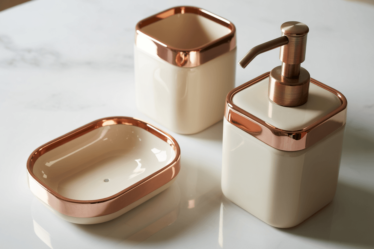 Um ein Statement in puncto moderner Klarheit zu setzen, eignen sich eckige Sets aus Kunstharz, die durch ein klares, zweifarbiges Design überzeugen – etwa mit weißer Basis und Roségold-Akzenten. Diese eleganten, zeitlosen Accessoires zeichnen sich durch ihre kantige Form und die glatte Oberfläche aus. Die geometrische Formgebung wirkt extrem aufgeräumt und löst sofort das Problem des Chaos. Die harmonische Farbkombination aus Weiß und dem warmen Metall-Finish verleiht dem Set eine dezente luxuriöse Note. Perfekt für einen Modern Classic Badezimmer Stil mit Fokus auf Struktur.