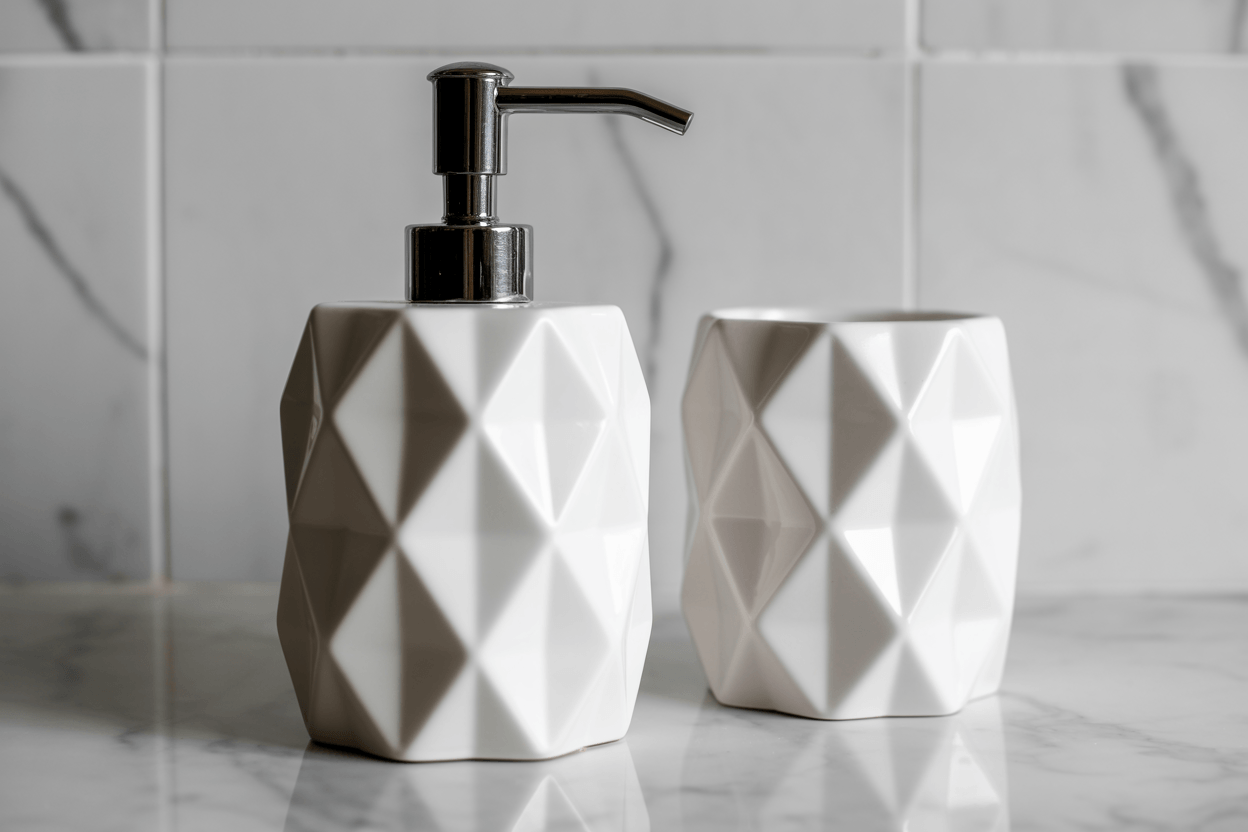 Für einen Look, der moderne Architektur mit haptischem Reiz verbindet, empfehle ich Seifenspender und Zahnputzbecher aus Polyresin mit geometrischen Prägungen – idealerweise in klassischem Weiß. Polyresin ist ein robustes Material, das sich vielseitig formen lässt, um eine dreidimensionale, facettenreiche Oberfläche zu kreieren. Diese elegante Oberflächenstruktur, die an geschliffene Steine oder Prismen erinnert, fängt das Licht auf spannende Weise ein, ohne auf grelle Farben zurückzugreifen. Die klare, zeitlose weiße Farbe sorgt für Sauberkeit und eine harmonische Basis, während die Struktur einen subtilen Akzent setzt. Solche Badezimmer-Accessoires sind perfekt, um einem minimalistischen Bad Tiefe zu verleihen.