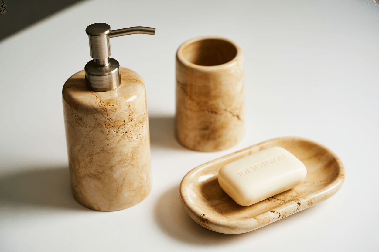 Für eine geerdete Eleganz, die sofort an ein Luxus-Boutique-Hotel erinnert, greifst du zu Seifenspendern und Bad-Sets in Marmor- oder Travertin-Optik. Diese Accessoires, oft aus Polyresin gefertigt, imitieren die natürliche, geäderte Textur von Stein in warmen sandfarbenen oder hellen Beige-Tönen. Ein solches elegantes Set – ob in matter Travertin-Optik oder als eckige Marmor-Optik – schafft einen ruhigen, skulpturalen Blickfang. Es löst das Problem des unruhigen Waschtischs, indem es Natürlichkeit und Struktur vereint und durch die harmonischen Farben eine Oase der Entspannung schafft.