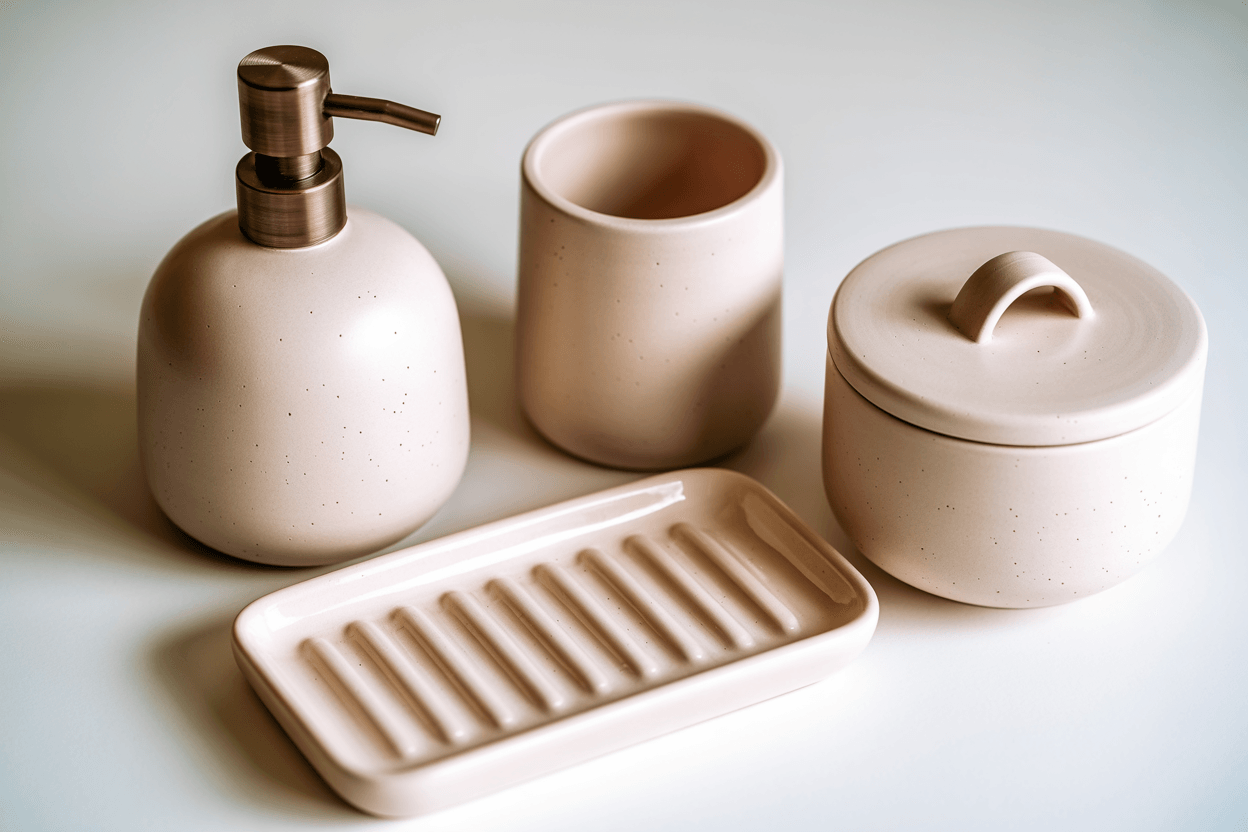 Wenn du einen weicheren, skandinavisch inspirierten Look bevorzugst, sind Sets aus glatt glasierter Keramik in warmen Beigetönen die beste Wahl. Die runden, sanften Formen dieser Zahnputzbecher und Seifenschalen wirken beruhigend und sind der Inbegriff von Gemütlichkeit. Die elegante Einfachheit und die neutrale Farbe verhindern visuelle Ablenkung und bringen einen Hauch von Hygge ins Bad. Diese Accessoires sind nicht nur funktional, sondern auch haptisch ansprechend – ein essentielles Element für einen zeitlosen und geerdeten Badezimmer Stil.