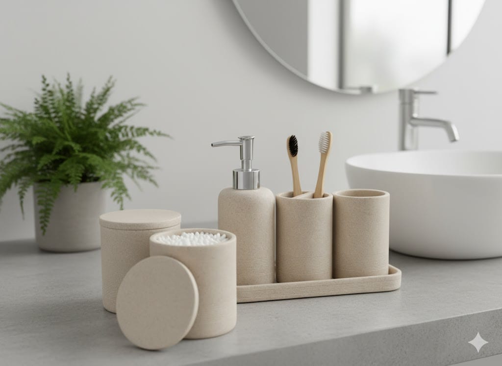 Zu guter Letzt schafft die Kategorie der organisierten Bad-Accessoires sofort Ordnung. Hierzu gehören Sets in Sandstein-Optik, die nicht nur aus den Einzelteilen wie Seifenspender und Seifenschale bestehen, sondern allesamt auf einem passenden Tablett arrangiert werden dürfen. Oft aus robustem Kunstharz gefertigt, bieten diese Stücke in harmonischen Farben wie Sand oder Taupe eine umfassende Lösung. Das Tablett vereint alle Funktionsteile visuell zu einer Einheit, was das Problem des Chaos auf dem Waschtisch effektiv löst und einen eleganten, aufgeräumten Eindruck hinterlässt.