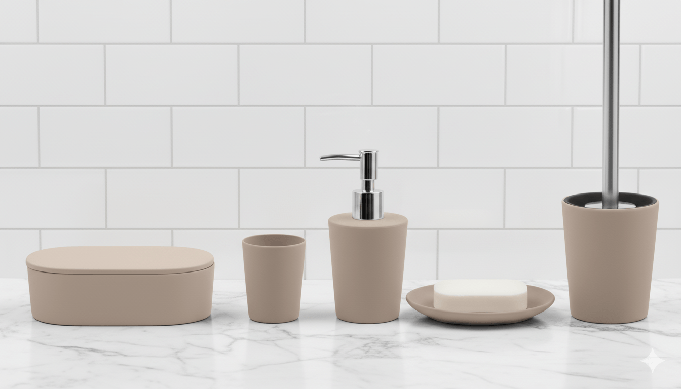 Für die maximale Harmonie im Bad sind umfassende Bad-Sets in Taupe oder Sandfarben ideal, die nicht nur den Waschtisch, sondern auch den WC-Bereich abdecken. Diese Sets bestehen oft aus einem Seifenspender, einem Zahnputzbecher und einem passenden WC-Bürstenhalter. Die Verwendung eines einheitlichen Materials in einer neutralen Farbe wie Taupe oder Beige, erzeugt einen besonders eleganten und zeitlosen Look im gesamten Raum. Durch die einheitliche Gestaltung aller Funktionselemente wird das Problem unpassender Einzelteile gelöst. Diese Accessoires sind ein Fundament für einen geordneten Badezimmer Stil.