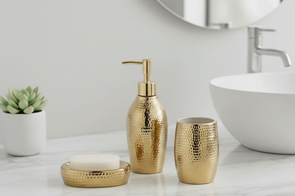 Für alle, die ihrem Badezimmer Stil eine dezente, aber glamouröse Note verleihen möchten, sind Accessoires in Gold-Optik das ultimative Statement. Diese eleganten Sets, imitieren die glänzende Textur von Metall und reflektieren das Licht auf wunderschöne Weise. Die goldene Farbe, kombiniert mit schlichten, runden Formen des Seifenspenders und Zahnputzbechers, wirkt besonders luxuriös, ohne kitschig zu sein. Gold ist eine harmonische Farbe, die hervorragend mit Weiß, Schwarz oder hellen Marmor-Elementen kontrastiert und das Problem der Langeweile löst. Da Gold ein klassischer Luxus-Akzent ist, sind diese Badezimmer-Accessoires eine zeitlose Investition, die jedem Bad sofort ein gehobenes, gemütliches Gefühl verleiht.