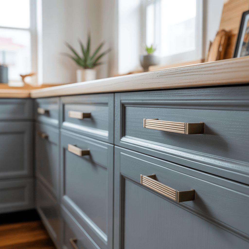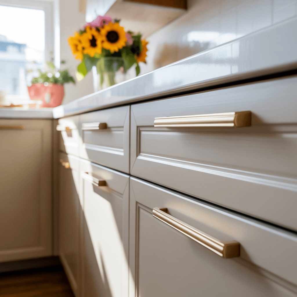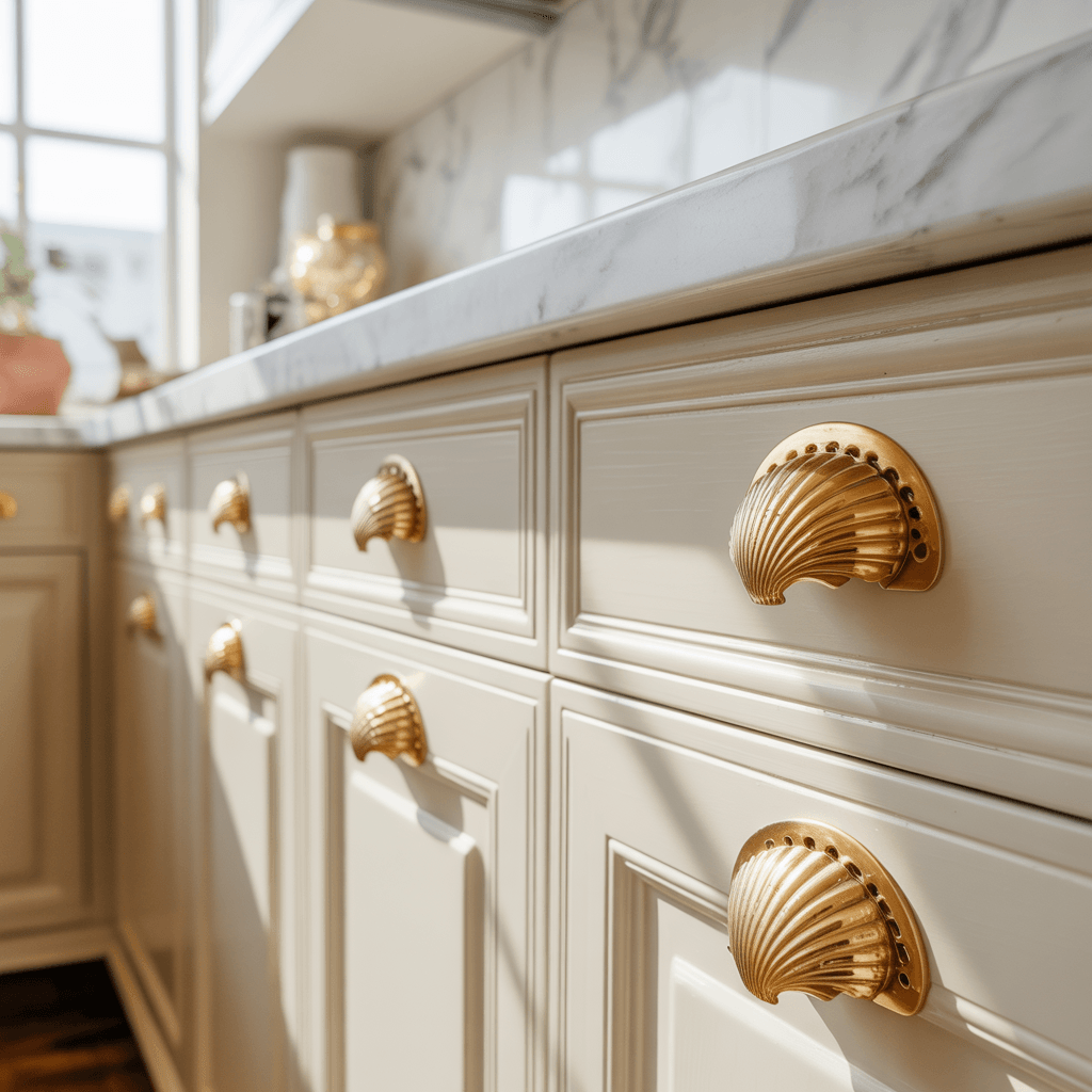 Neue Griffe und Knäufe (Messing, Edelstahl, Schwarz-Matt) bringen sofort ein modernes Finish, zum Bespiel diese goldenen Muschelgriffe* oder andere schicke Griffe von Amerdeco*