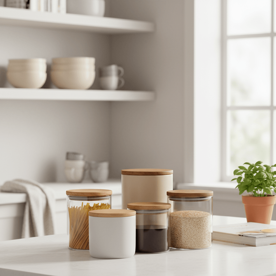 Keramik- oder Glasvorratsgläser für trockene Lebensmittel, zum Beispiel die super schönen Vancasso Vorratsdosen*, die gleichzeitig noch kleine Farbakzente setzen