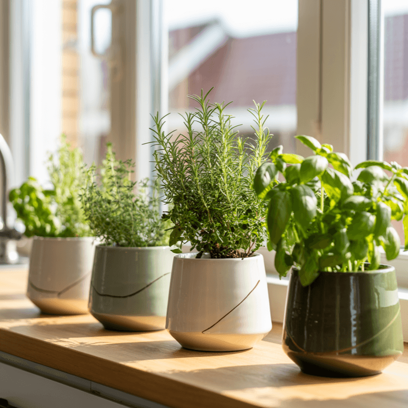 Frische Kräuter in schlichten Töpfen