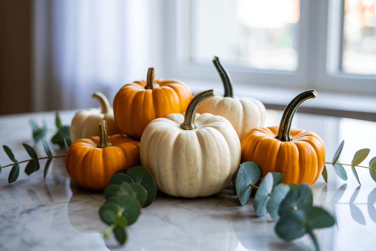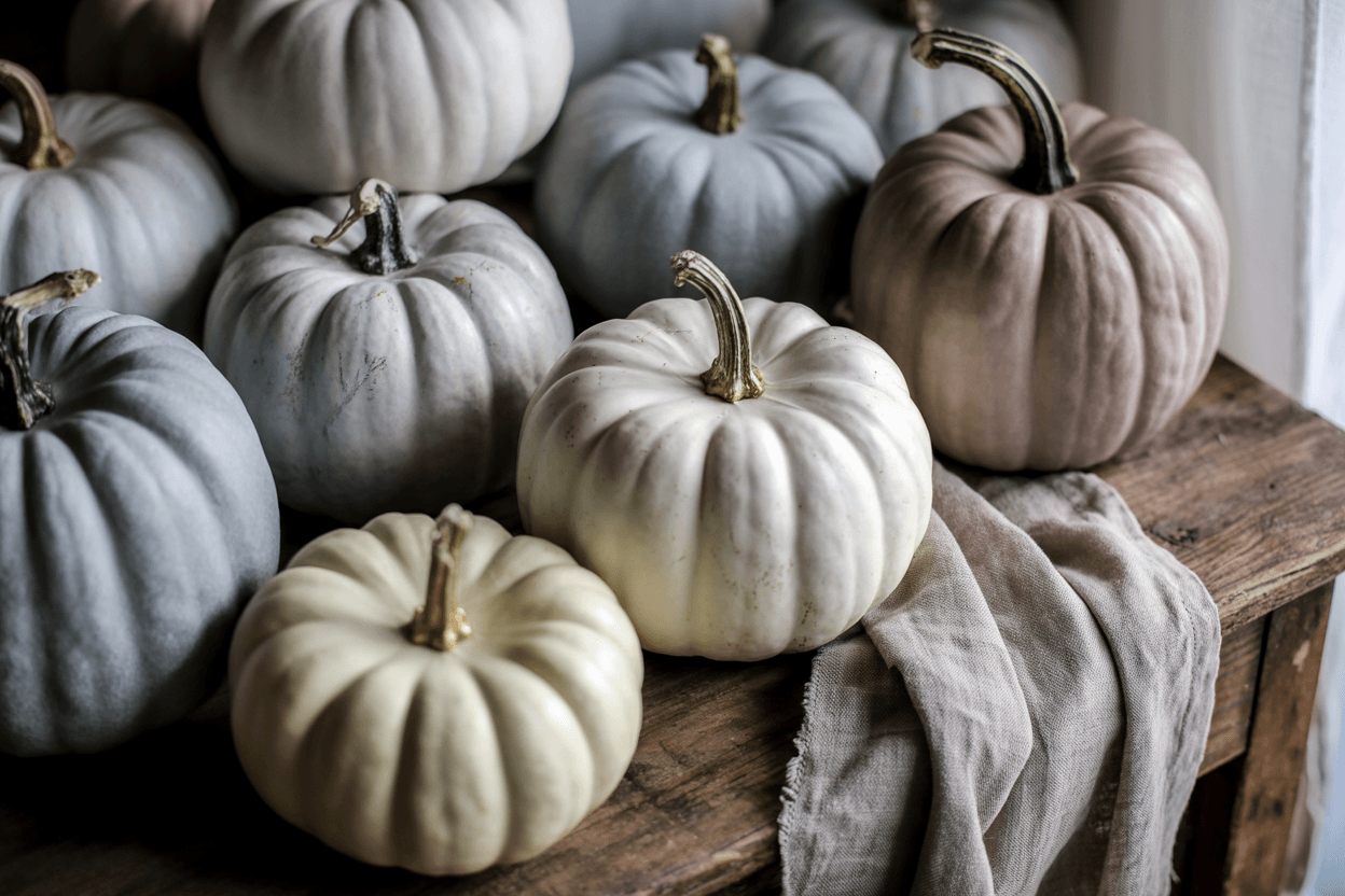 Kürbisse in neutralen Tönen: Holz- oder Keramik-Kürbisse* in Weiß, Grau oder Naturfarben, auf Wunsch kombiniert mit Orange.