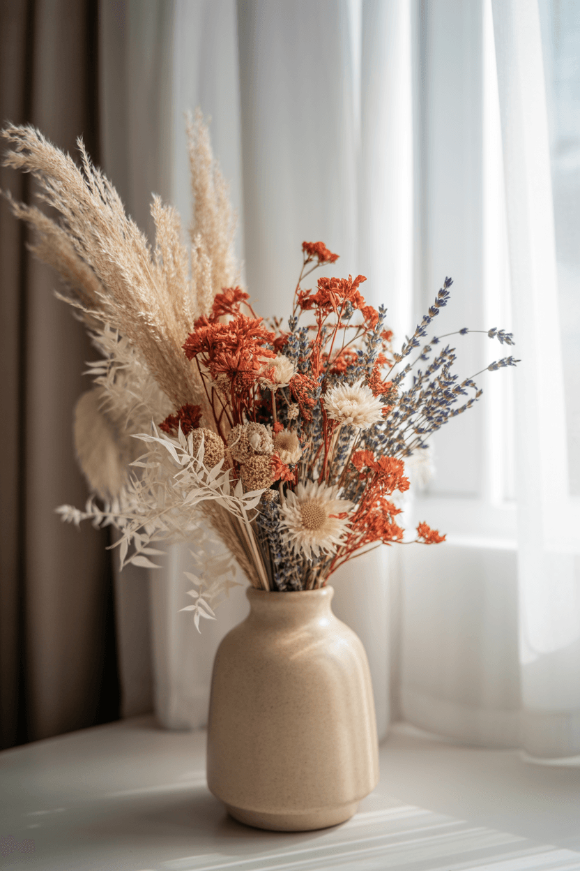 Trockenblumen & Gräser: Pampasgras, Eukalyptus oder Hafer wirken dezent, aber herbstlich.