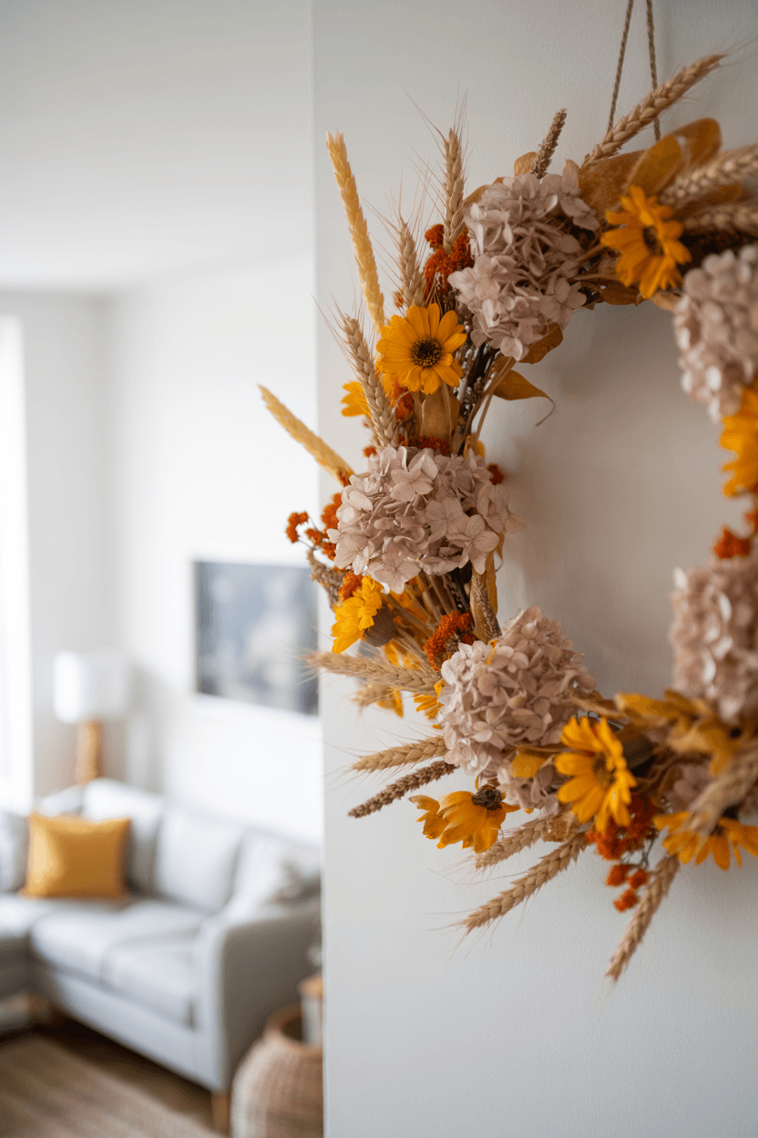DIY-Herbstkranz: Ein Kranz aus getrockneten Herbstblumen wirkt edel und passt perfekt über den Esstisch.