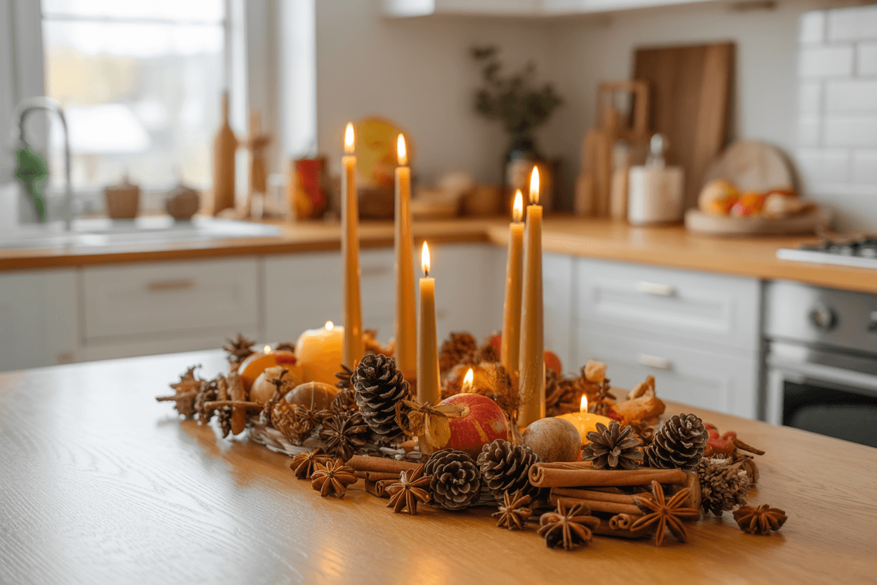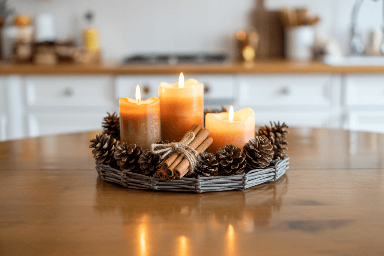 Kerzen-Arrangements: Weiße, graue oder hellbraune Stumpenkerzen in Gläsern oder Keramikschalen wirken elegant, ein Holztablett kann Wärme schaffen. Toll sind auch Duftkerzen mit herbstlichem Aroma*.