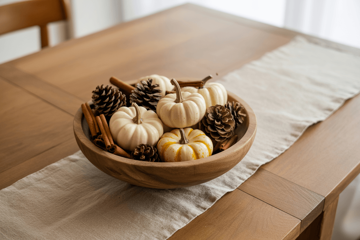 Schalen-Deko: Fülle eine Holzschale* mit weißen Mini-Kürbissen, Zapfen* und Trockenblumen.