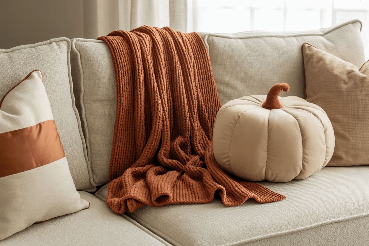 Kissen & Decken: Tausche helle Sommertextilien gegen Strickkissen in Beige oder Wolldecken in Creme. Gezielte Farbakzente in Orange oder Rostrot runden das Bild ab, zum Beispiel diese karierte Kuscheldecke* oder diese Kissenbezüge in warmen Orange*