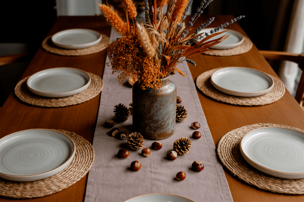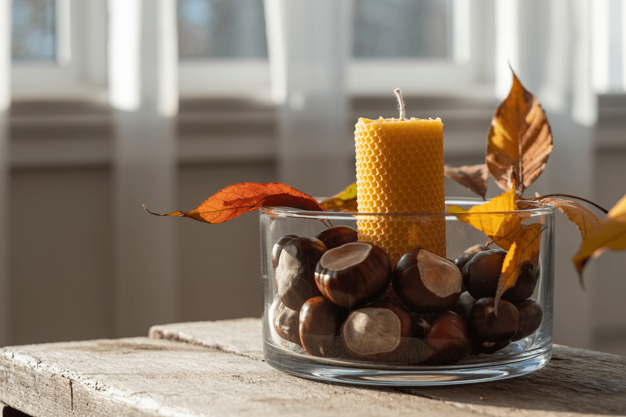 Befülle einfache Glasvasen oder Einmachgläser mit getrockneten Blättern, Zweigen oder Nüssen. Eine schöne Stumpenkerze hinein – fertig ist die neutrale Herbstdeko für den Tisch.