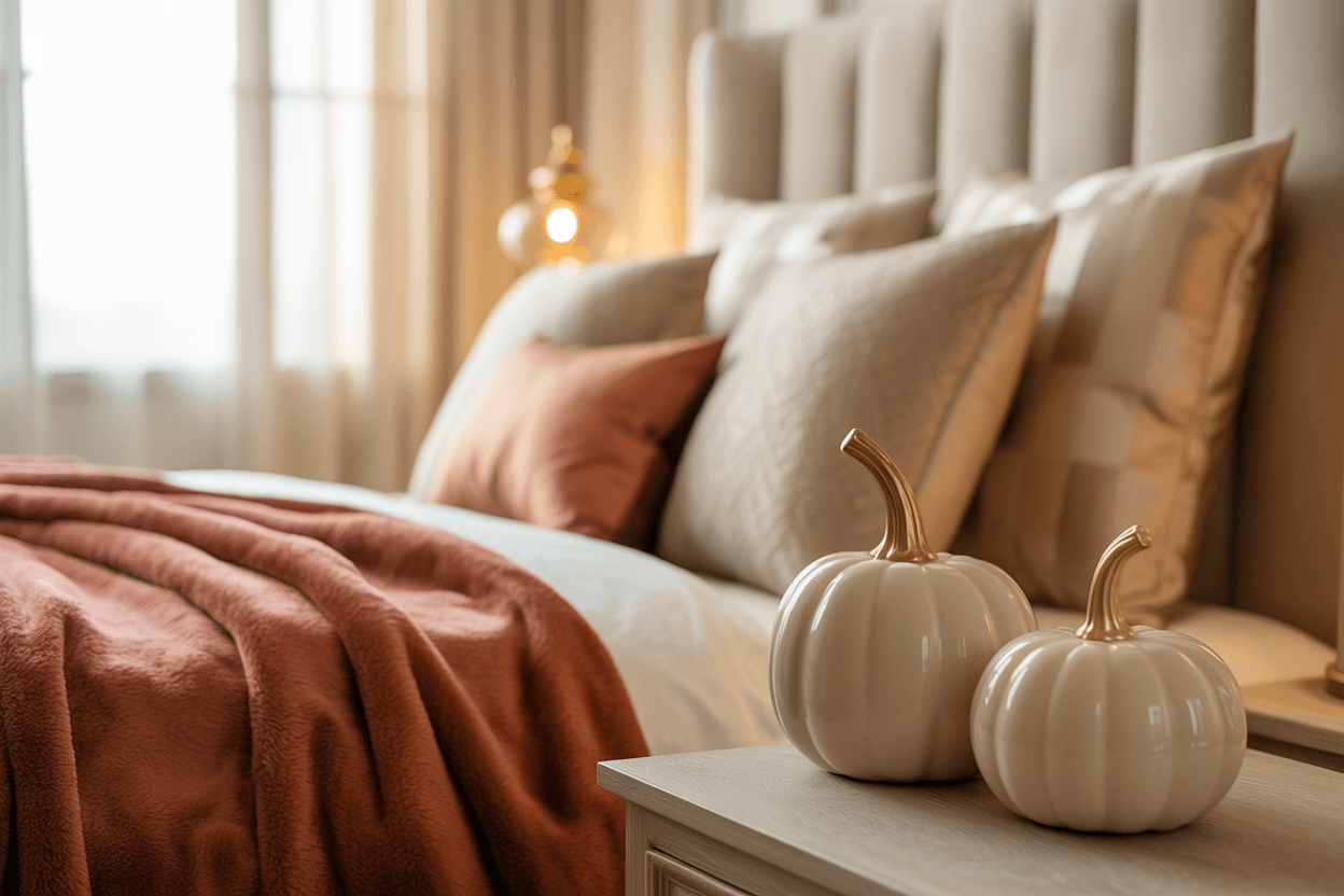 Schlafzimmer: Kuschelige Tagesdecken* in Beige, rostrot oder Taupe, ergänzt durch neutrale Zierkissen. Ein Strauß getrocknete Herbstblumen* auf dem Nachttisch oder der Kommode bringt Herbststimmung.