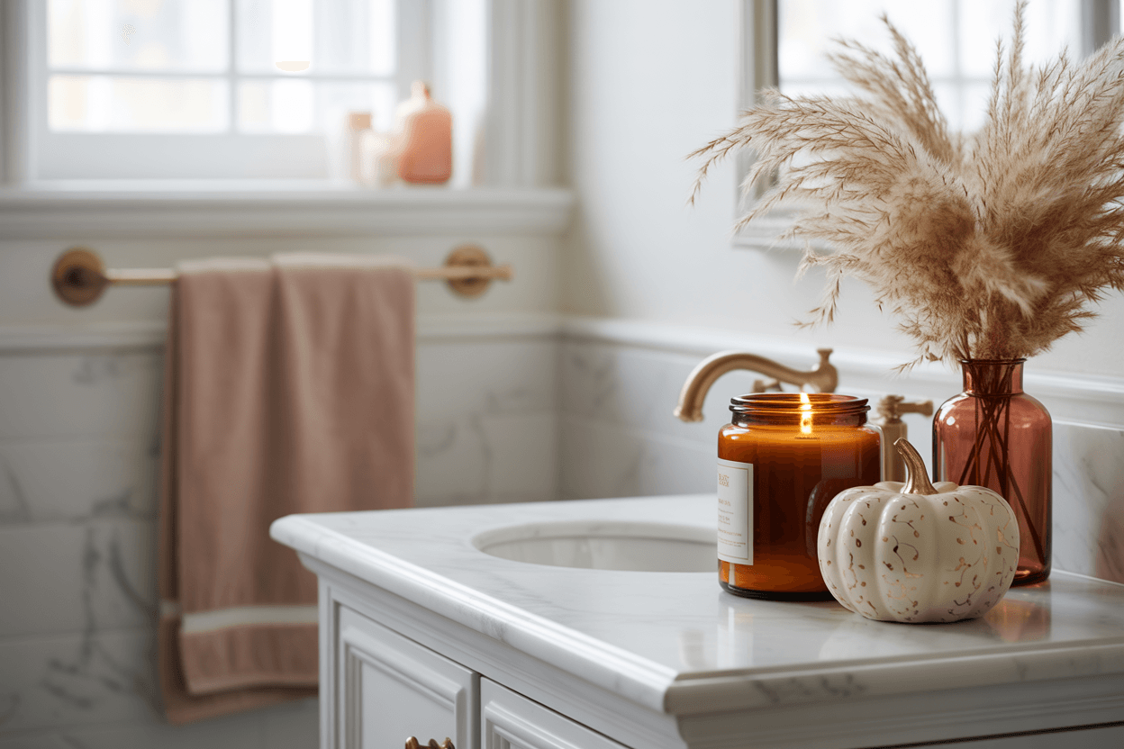 Badezimmer: Kleine herbstliche Kerzen*, ein Strauß Pampasgras in einer Steinvase und naturfarbene Handtücher* sorgen für ein Spa-Feeling im Herbst.