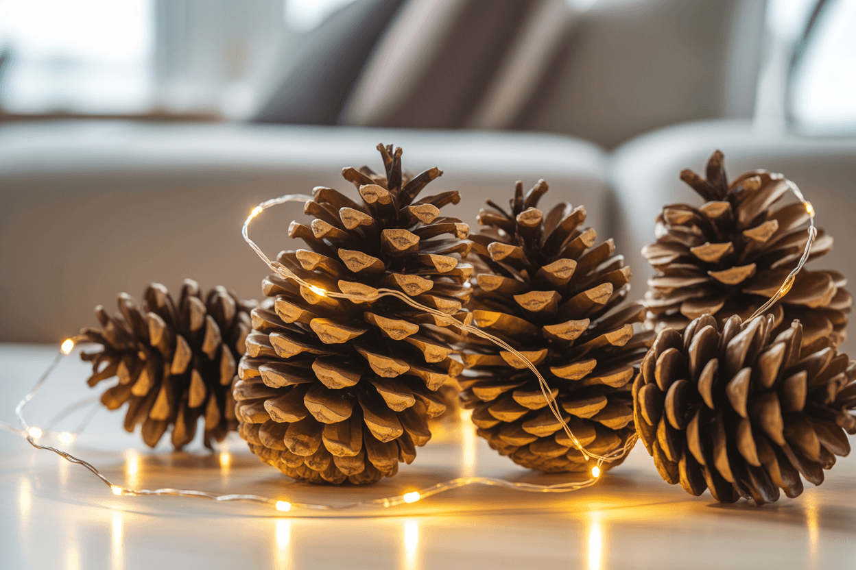 Sammle Tannenzapfen und dekoriere sie mit einer feinen Lichterkette. Gerade für die Abenden ein einfaches und wunderschönes Herbst-Statement.