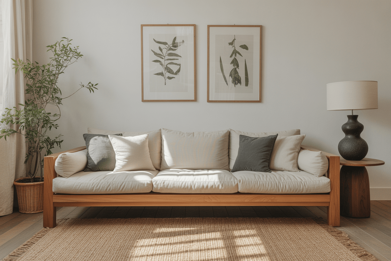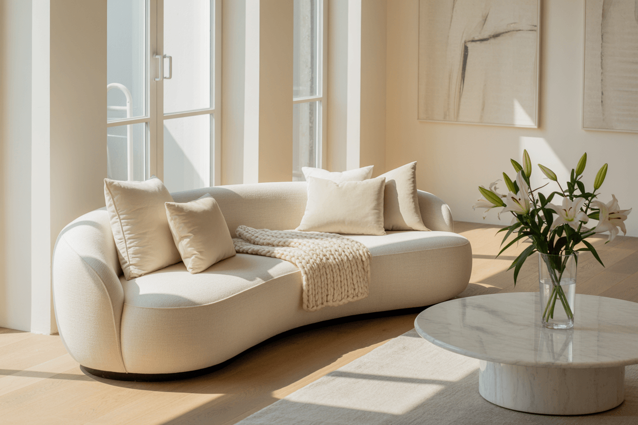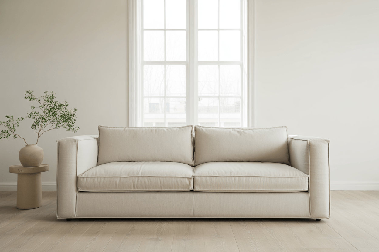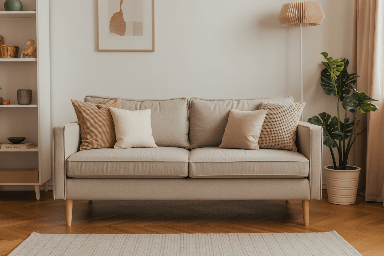 Mit einem neutralen Sofa als Basis kannst du deinem Wohnzimmer Flexibilität, Ruhe und zeitlose Eleganz verleihen, während Kissen, Decken und Accessoires deinem persönlichen Stil Ausdruck verleihen.