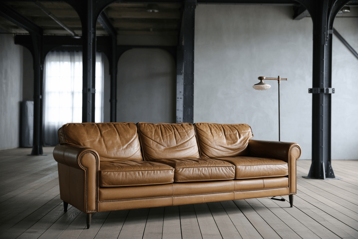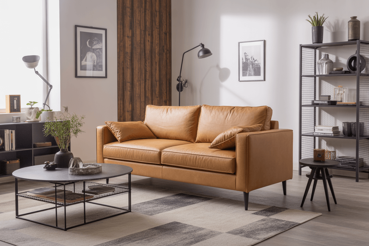 Im Industrial-Stil treffen rohe Materialien auf kühle Farben. Ein neutrales Sofa aus Leder oder robustem Stoff harmoniert mit Metallgestellen, Sichtbeton und dunklen Holztönen. Akzente wie grobe Teppiche oder Lampen im Factory-Look runden das Konzept ab.