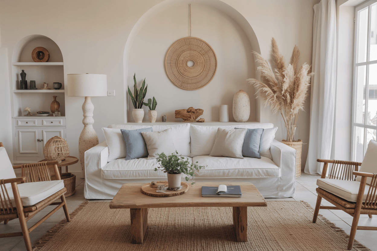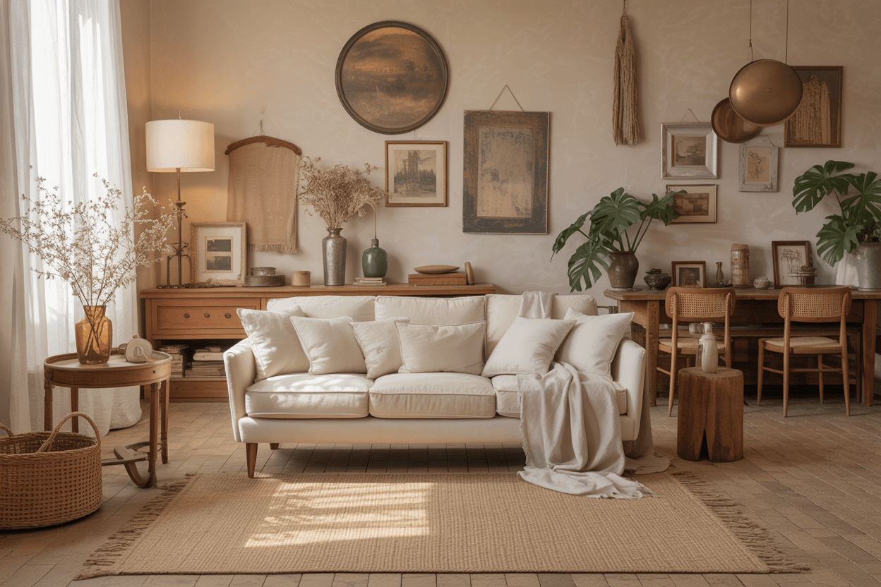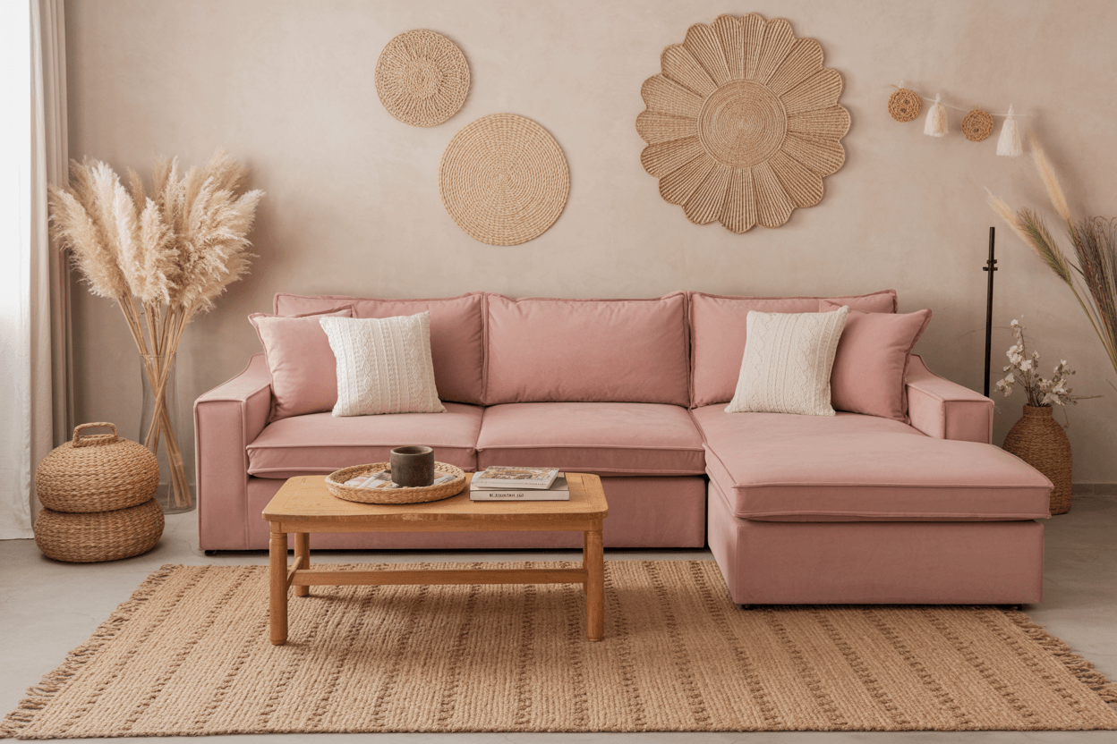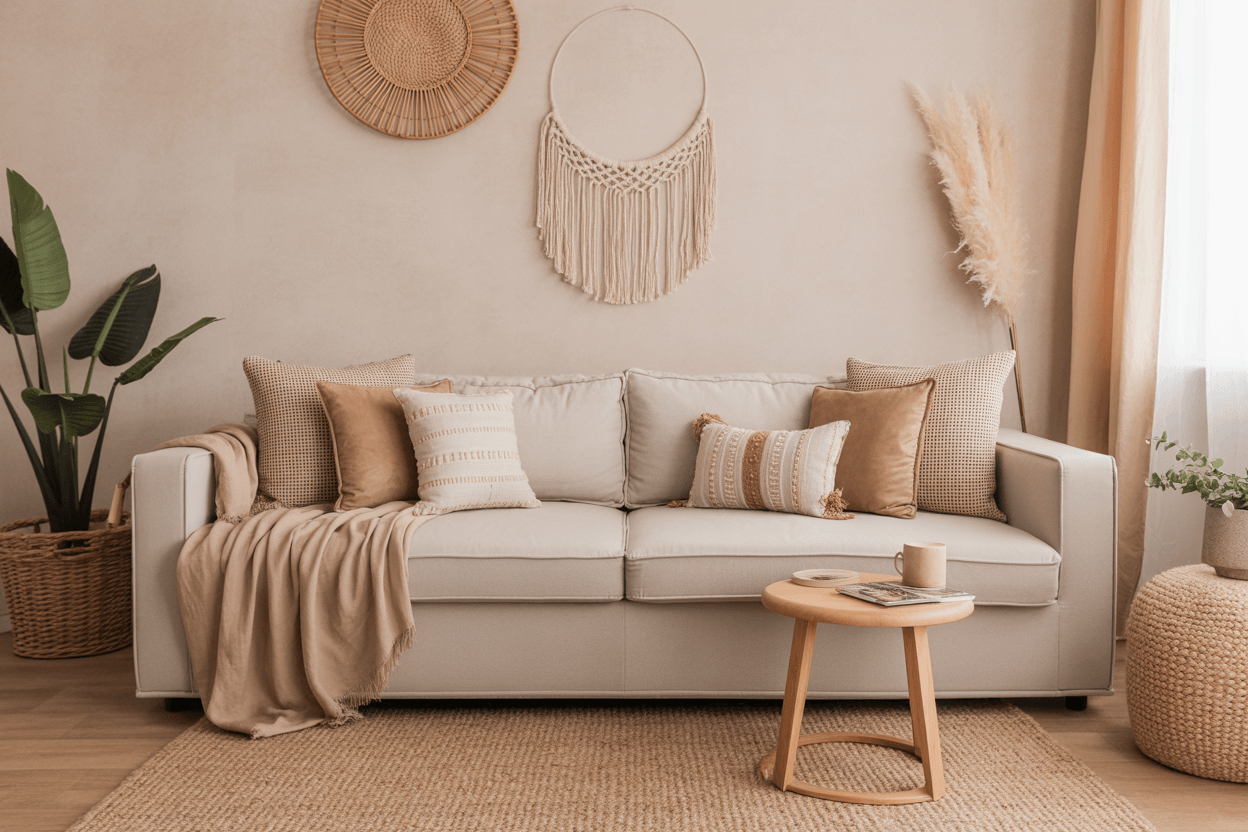 Boho liebt Muster, Farben und Texturen. Ein neutrales Sofa wirkt hier wie ein ruhiger Anker, um den Raum trotz vieler Accessoires harmonisch zu halten. Mit Kissen im Boho-Stil*, Makramee-Wanddeko* und Teppichen aus Naturmaterialien* entsteht der perfekte Boho-Look.