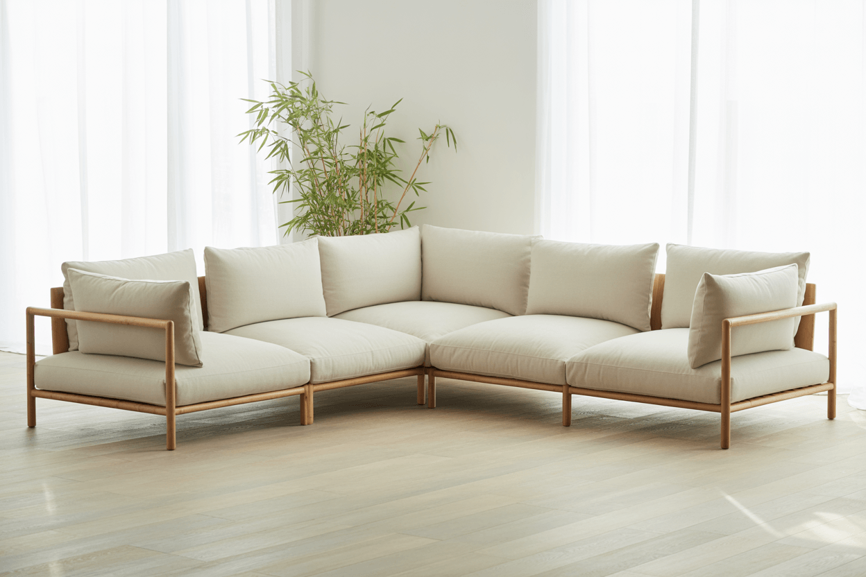 Das Ecksofa KERKKO, dessen Holzrahmen klare, schlichte Linien unterstützt