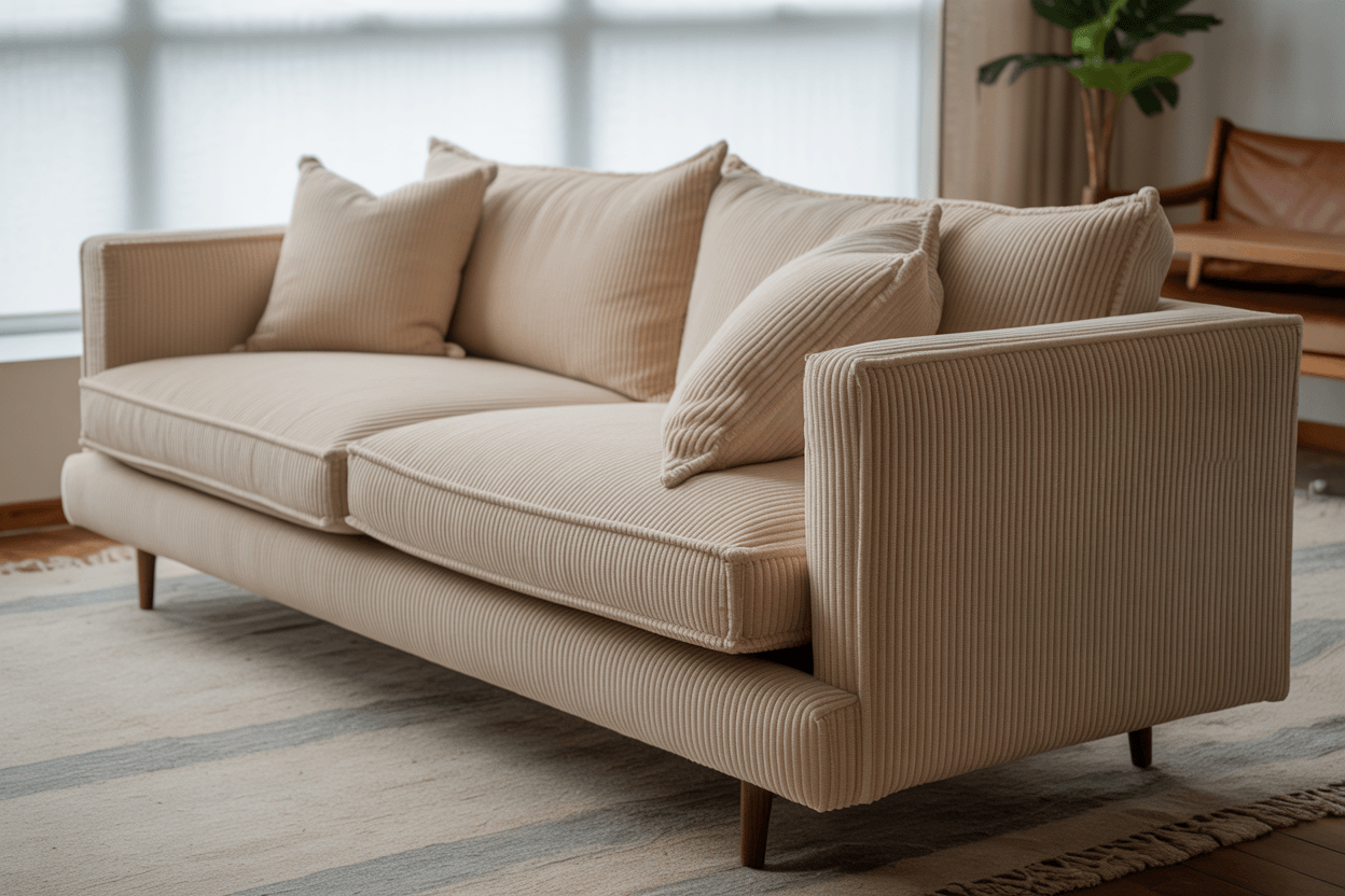 Möchtest du einen größeren Retro-Vibe schaffen, kannst du zu einem Sofa mit Cordstoff greifen, wie zu diesem praktischen Ecksofa mit Schlaffunktion* oder dem Einzelsofa Ceni für 3 Personen
