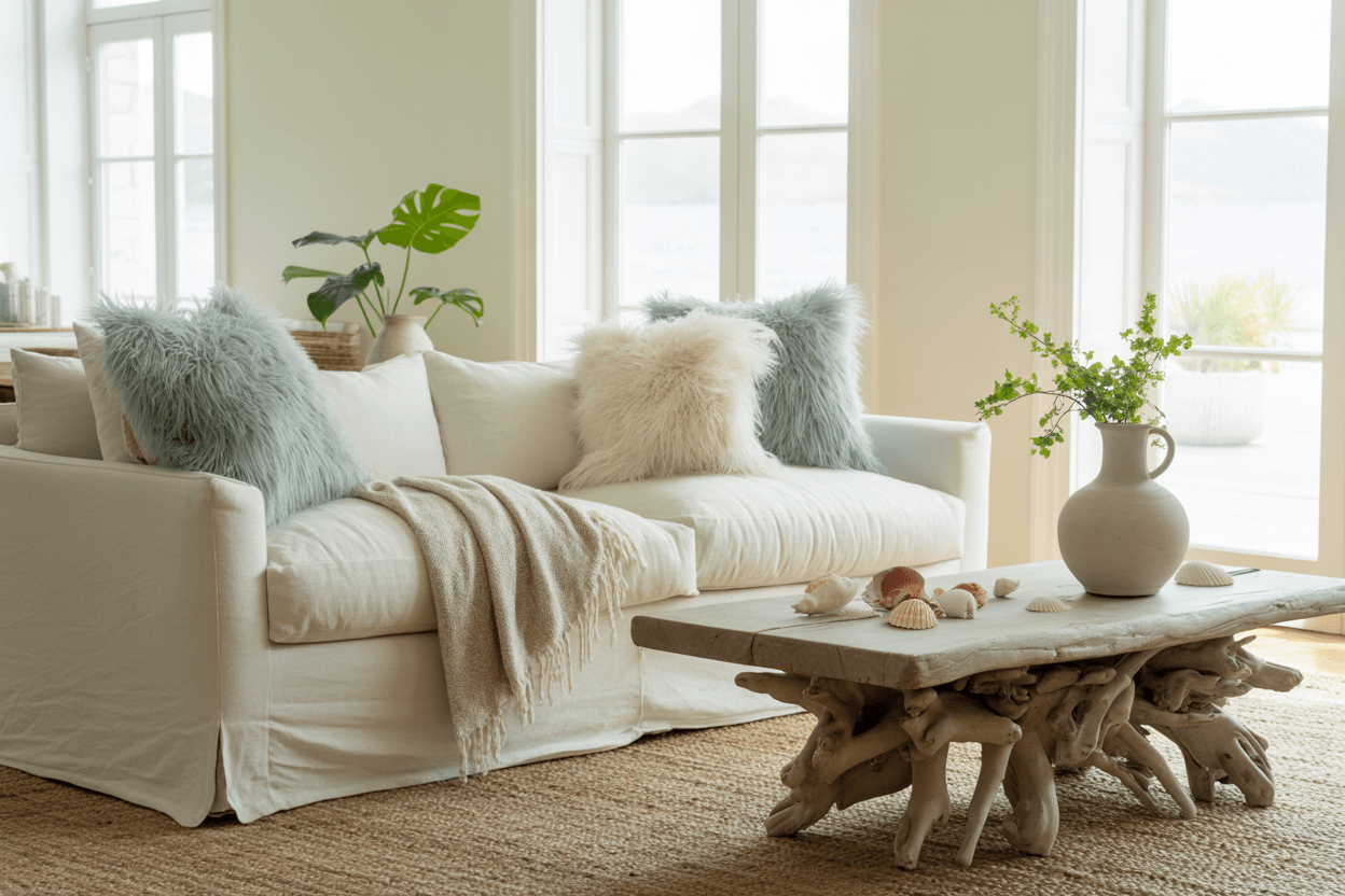 Helle, luftige Räume mit viel Licht, Naturmaterialien und maritimen Akzenten. Ein Sofa in Beige, Weiß oder Sand passt perfekt zu hellen Holzmöbeln, Leinenvorhängen und Blauakzenten in Kissen* oder Teppichen. Ein Couchtisch mit Treibholzdekor* setzt ein gelungenes Highlight.