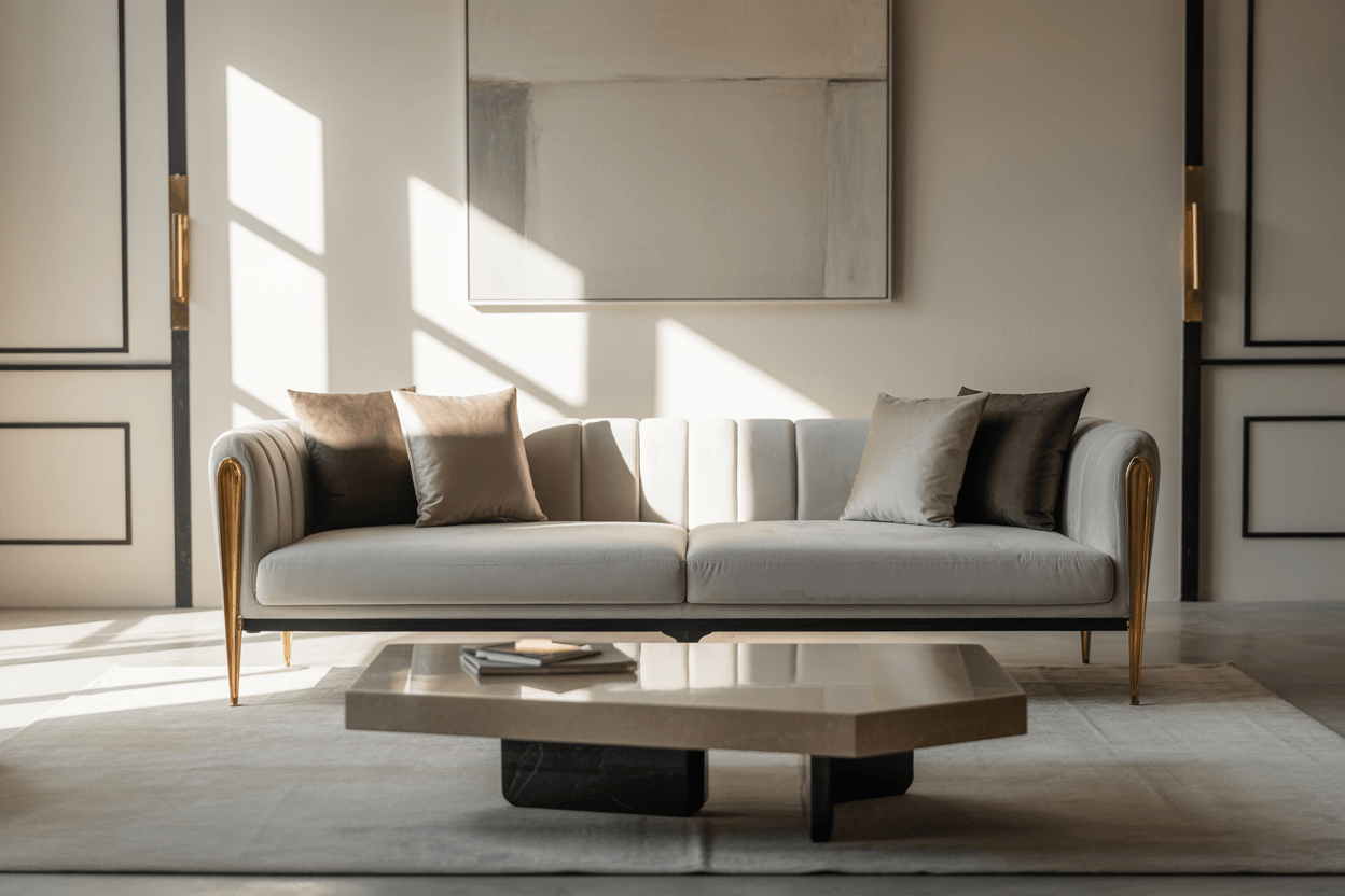 Ein modernes Wohnzimmer lebt von klaren Linien und minimalistischer Eleganz. Ein Sofa in Grau oder Taupe fügt sich perfekt ein. Hier gilt: weniger ist mehr – wenige, hochwertige Accessoires, z. B. ein puristischer Couchtisch, genügen.